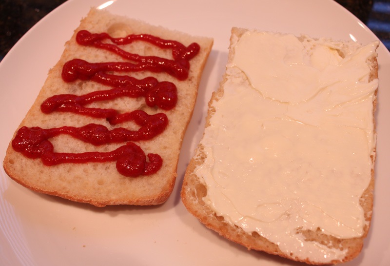 Start with slathering on the sriracha and mayo on to each half of the bread.