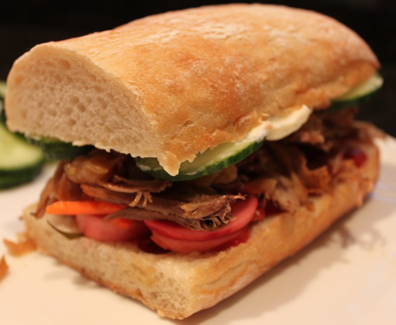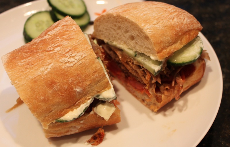 Bahn mi sandwiches are characterized, first, by their meat components (usually pork). Next, traditionally, is some kind of pickled vegetable (carrots commonly). In addition to pickled veggies there is usually a fresh vegetable component for crunch (cucumbers). And finally you can’t forget the binding agent, some combo of mayo and hot chili paste. Top it with cilantro and you have a delicious Eastern inspired sandwich. I used all of these simple foundational ingredients to build my own right at home.