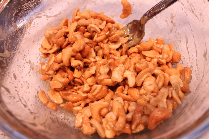 Mix everything but the cashews in a big bowl. Make sure the mixture is fully combined and then add the cashews. Toss carefully to coat each piece.