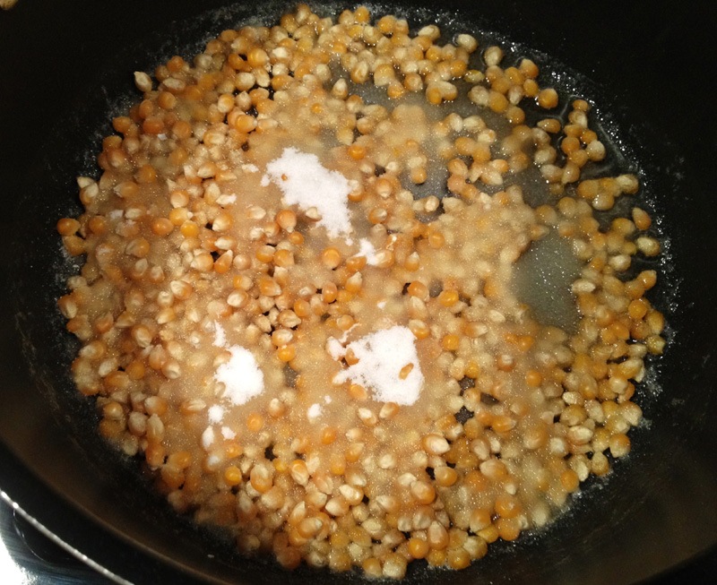 When the popping has completely stopped turn off the heat, remove the lid, and sprinkle on half of the salt.