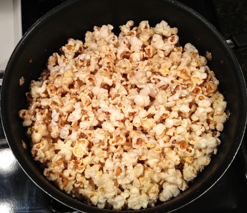 Make sure the lid is on tight and the heat is medium-high. Every 10 seconds or so you’ll need to shake the pot a little to make sure none of the kernels are sticking to the bottom or burning. This is relatively easy – put on potholders, hold the handles of the pot while keeping your thumbs on the lid, and shake gently. The popcorn will take 1-3 minutes to start popping. Keep shaking at 10 second intervals throughout the cooking process.