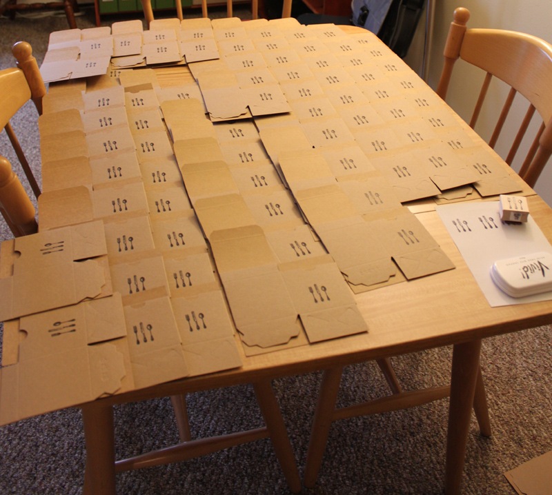The first step to prepping the boxes was to stamp them all and cut the baker’s twine for the outside. The stamp we used for the favors was the same silverware stamp from PaperSource that we used on our wedding place cards and favors. I like subtle themes that are carried throughout for weddings.