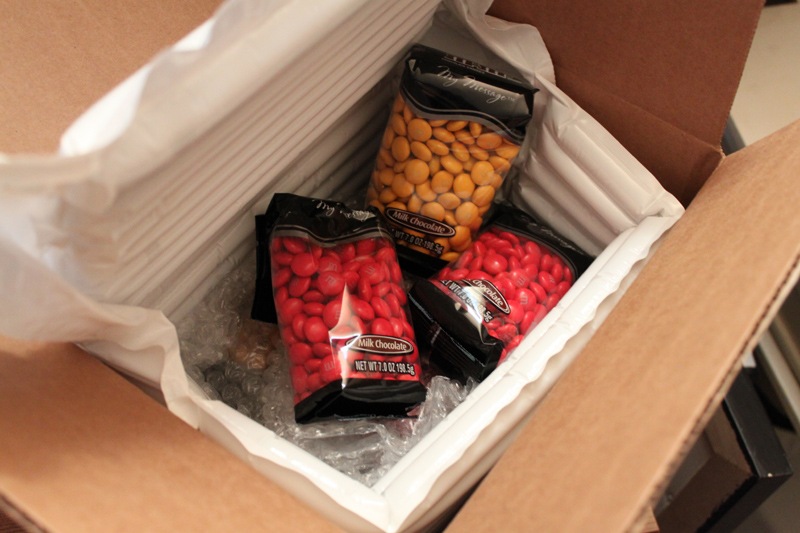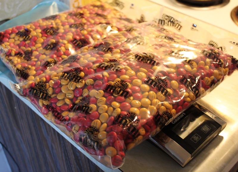 The next step was to portion out the M&Ms into food grade bags (which explains the use of the scale in the picture above, we weighed it all out to make sure we divided them evenly).