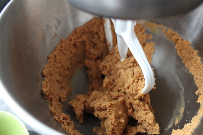 Combine one cup of sugar, peanut butter, and molasses in a bowl or stand mixer.