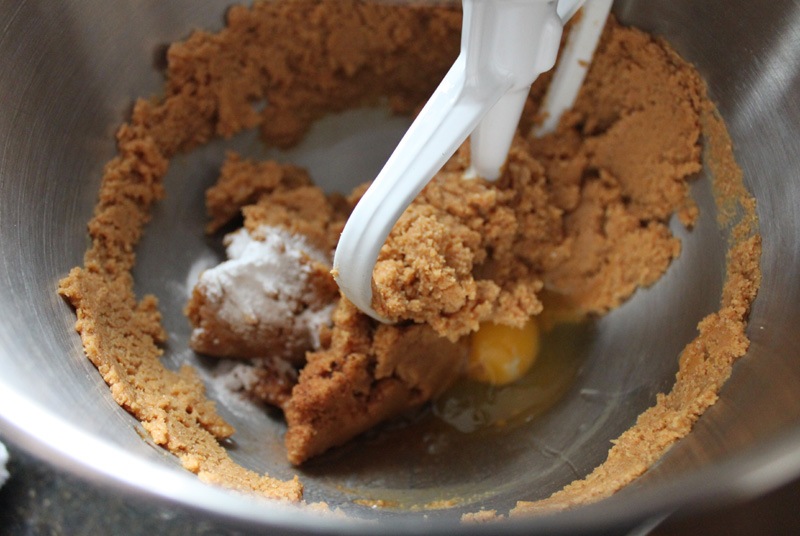 Next add the egg, nutmeg, and baking powder. Make sure everything is mixed thoroughly. Scrape down the sides of the bowl if you need to.