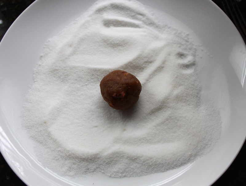 On a large plate spread out the remaining 1/2 cup of sugar. Roll each ball around in it until it’s lightly coated.