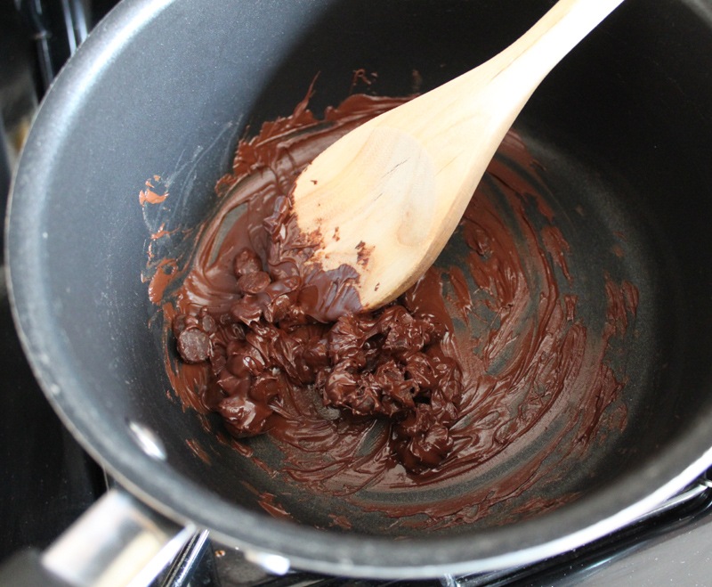 When the chocolate is fully melted add in the dry ingredients (sugar, cocoa powder, espresso powder, cornstarch, and salt) and stir to combine.