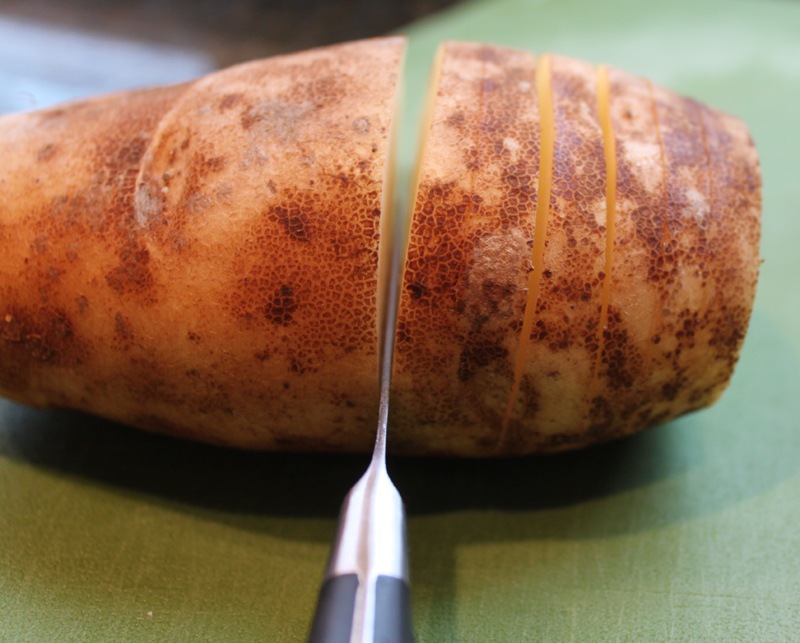 Wash each potato and carefully cut thin slices throughout without cutting all the way through the potato. If you slip up and cut through a piece it’s ok, I have it covered – keep reading.