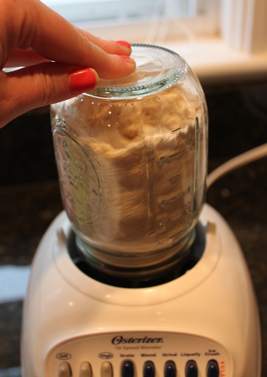 A mason jar will fit perfectly on your blender with the blender blade attachment. Simply screw it on to the bottom of the jar exactly how you would with the full sized blender container. It couldn’t be simpler. I used a 12 oz. mason jar here but I think any size (except wide mouthed jars) will work here.