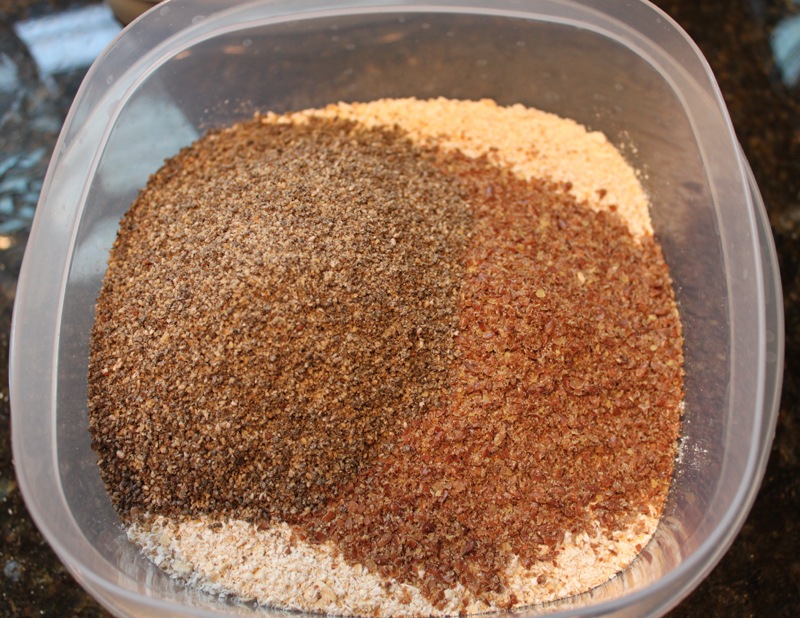 I ground up my flax and chia seeds in the blender the same way. I combined them all in a tupperware container for the week’s worth of smoothie bases and stored in the fridge.