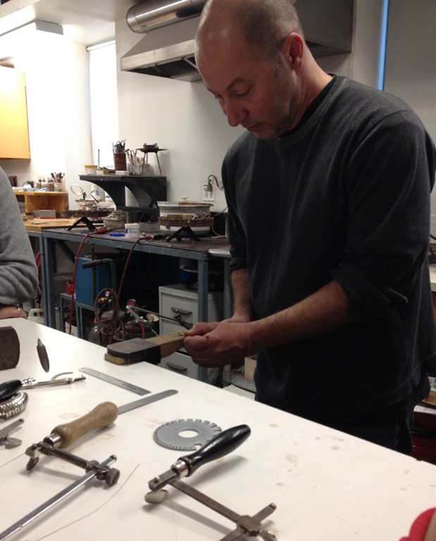 The instructors, Peter and Ruth, were excellent – totally encouraging and very knowledgeable. We learned the in depth process of how to treat the metals, different options for designing the rings, soldering, and sizing the rings. Here is Peter going over each step to ring making: