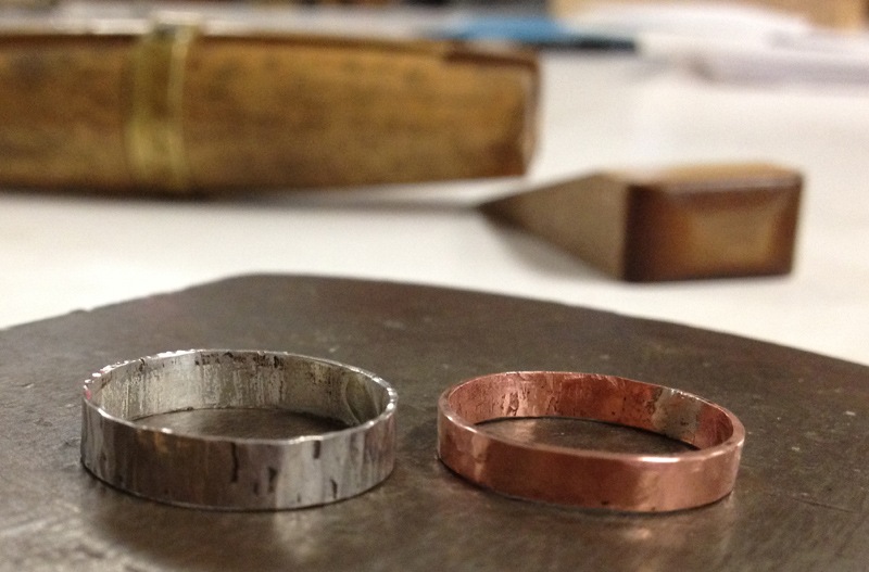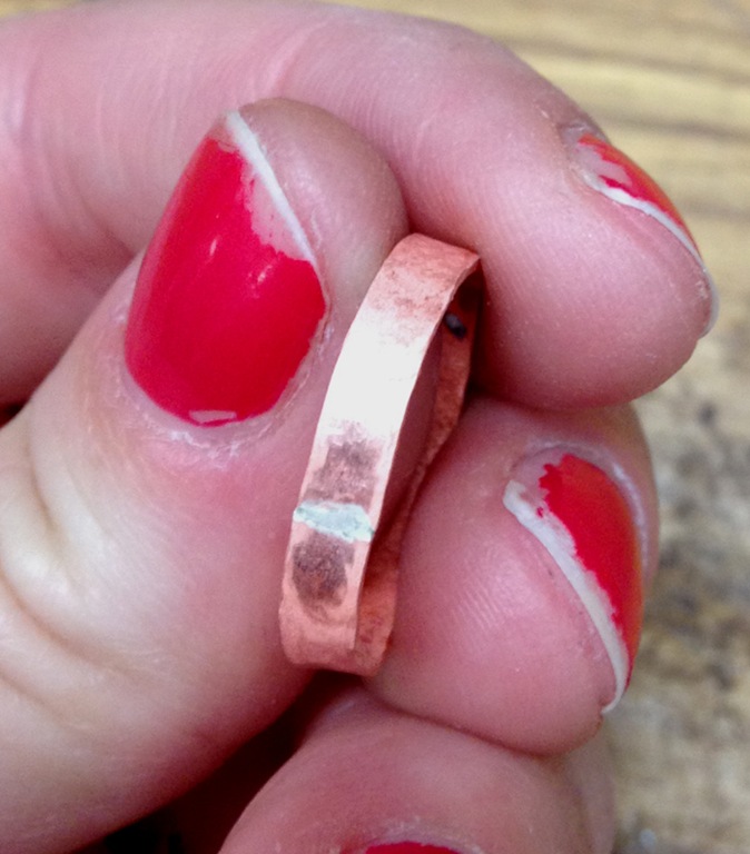 My finished rings! It’s a little hard to see in these photos but the copper ring has a hammered effect to it and the silver ring has a vertical line texture. You can see it best in the last photo below.