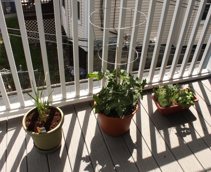 When we got home we found the best spot for our garden – the western corner of our front porch. It gets sun pretty much all day and the porch bars will keep out critters.