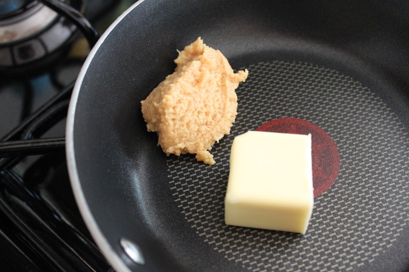 Start by browning the garlic and butter over medium heat. When the garlic has just browned turn off the heat and let the mixture cool.