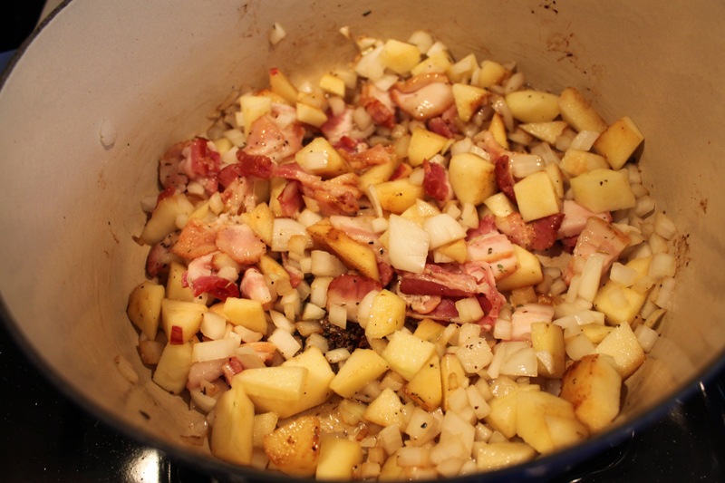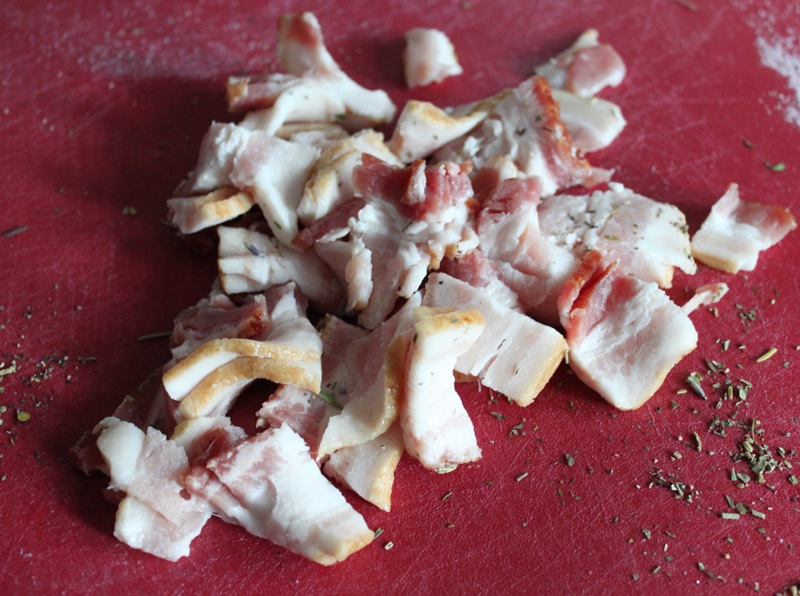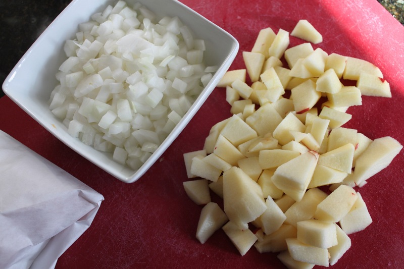 Chop the onion and apple into rough cubes (doesn’t need to be exact) and slice up the bacon.