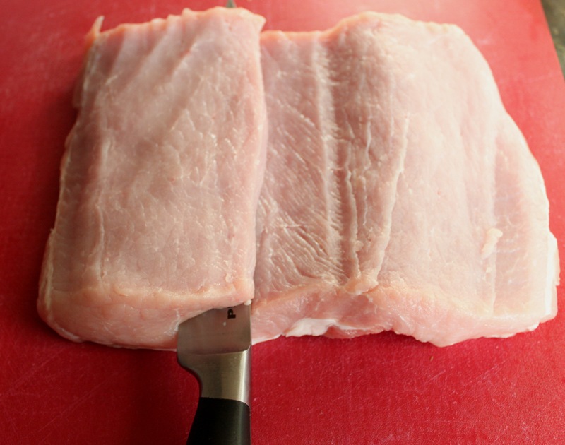 Next, open the flap you just cut. Making a steady cut, slice into the pork halfway through the larger piece (on the left here). Make other horizontal cut, stopping again about a half an inch from the edge. The pork loin should then open like a book in three sections. I hope this all made sense, or at least the pictures were helpful!