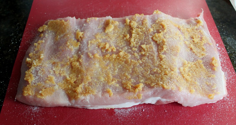 Sprinkle salt and sugar evenly onto the pork and rub it into the meat. Then, take the cooled garlic butter and spread that out evenly as well.