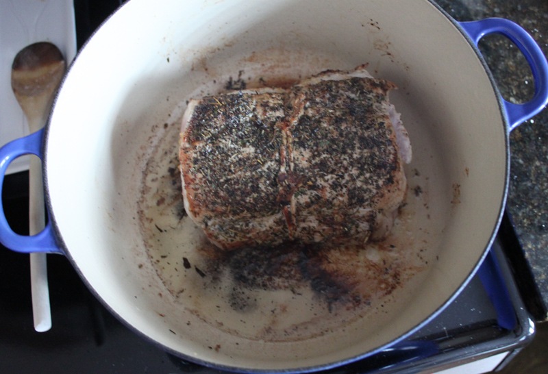 In a heavy cast iron dutch oven (I used my 5.5 quart Le Creuset) heat the vegetable oil over high heat. When it’s hot enough (slightly smoking) drop in the pork loin and sear on each side. You’re looking for a lovely brown caramelization on each side of the loin.