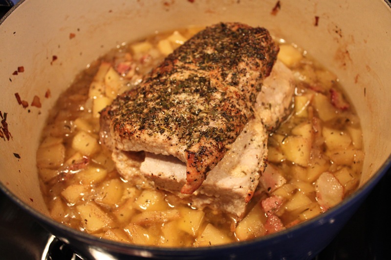 When the apple and onion have become tender, nestle the pork loin down into the pot.