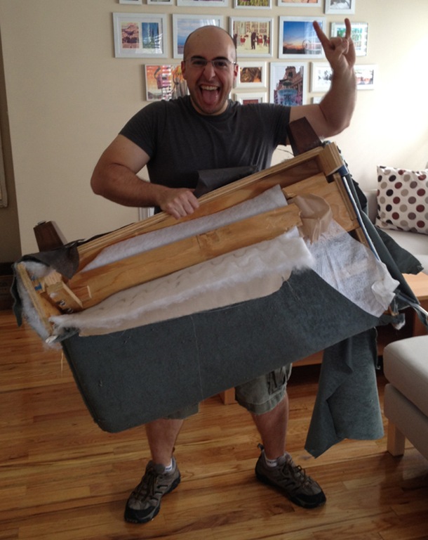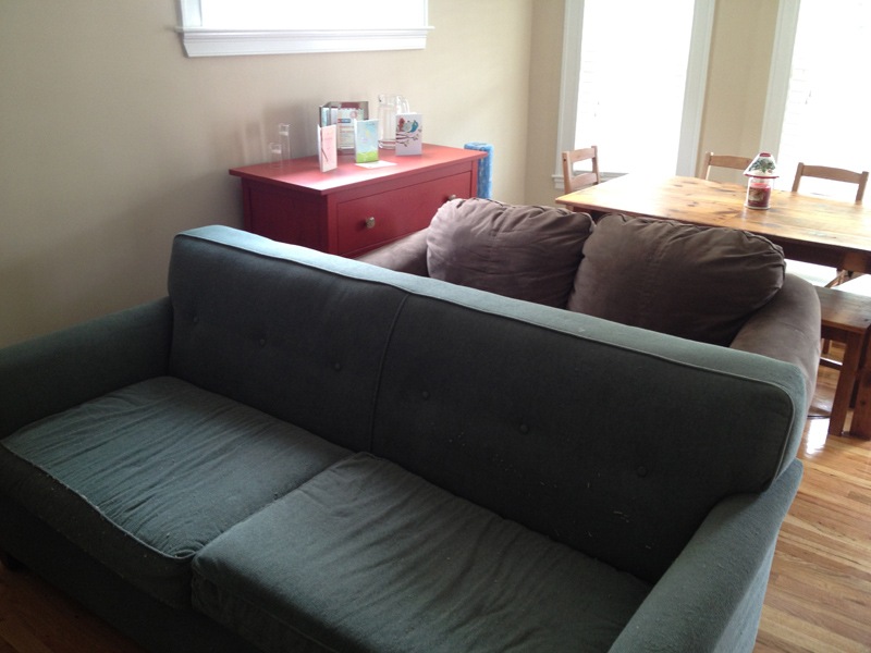 With the new couch in place, the next step was obviously to get rid of the two old couches. I’m the type of person who recycles everything, especially furniture. I have such fond memories of the mismatched, well loved, recycled furniture I was given to furnish my first few apartments. So it really made me sad that we wouldn’t be able to recycle our old couches. Our house was built 100 years ago and the stairwells just do not permit couch moving. When we moved in the movers had to winch them up over the balcony, a process we did not want to repeat.