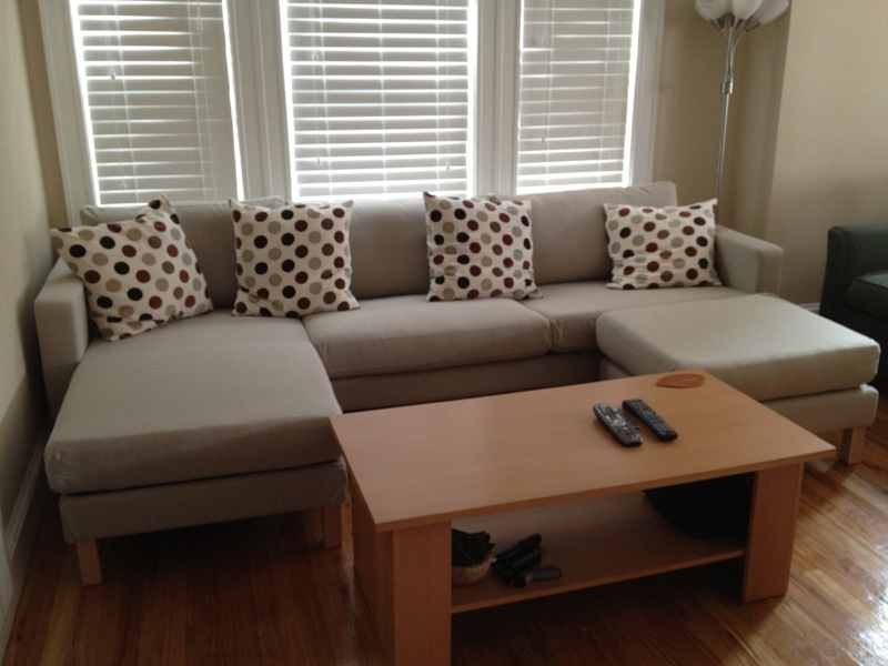 It fits in the space in the space perfectly. As you can see here we now need to get a new coffee table because with the chaise and the ottoman we bought, it doesn’t really work anymore.