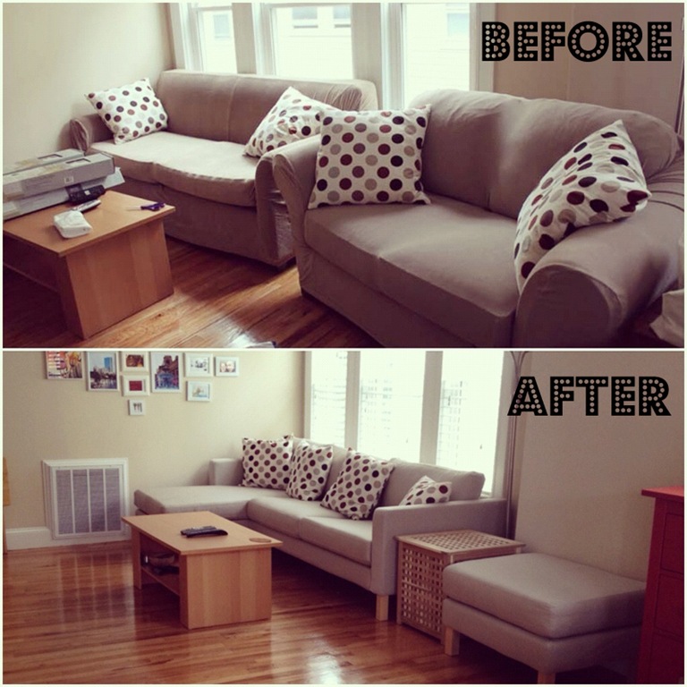 The final step was a new couch! We had two couches that didn’t match (despite our efforts with matching slipcovers) and weren’t utilizing the space of the room very well. We really wanted a sectional couch but weren’t sure we could fit one in the space we had. We looked all over the place for a few months and couldn’t find anything we loved in our price range that would fit. A month or so ago I saw this entry about the sectional over at Young House Love and suggested we check out IKEA. We headed to the store, saw their Karlstad, and knew it would be perfect!