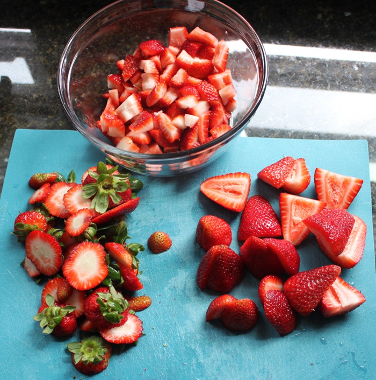 The recipe couldn’t be easier. First, rinse and chop up the strawberries. Slice five of the biggest ones in half to garnish the top.