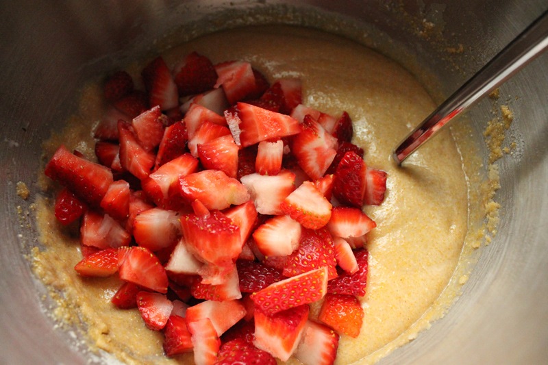 The bread itself is slightly sweet, has the perfect crunch from the corn meal, and is bursting with the freshness of the strawberries. The batter provides a light and fluffy cushion for all of those delicious chopped berries. I can’t think of anything more perfect for summer.