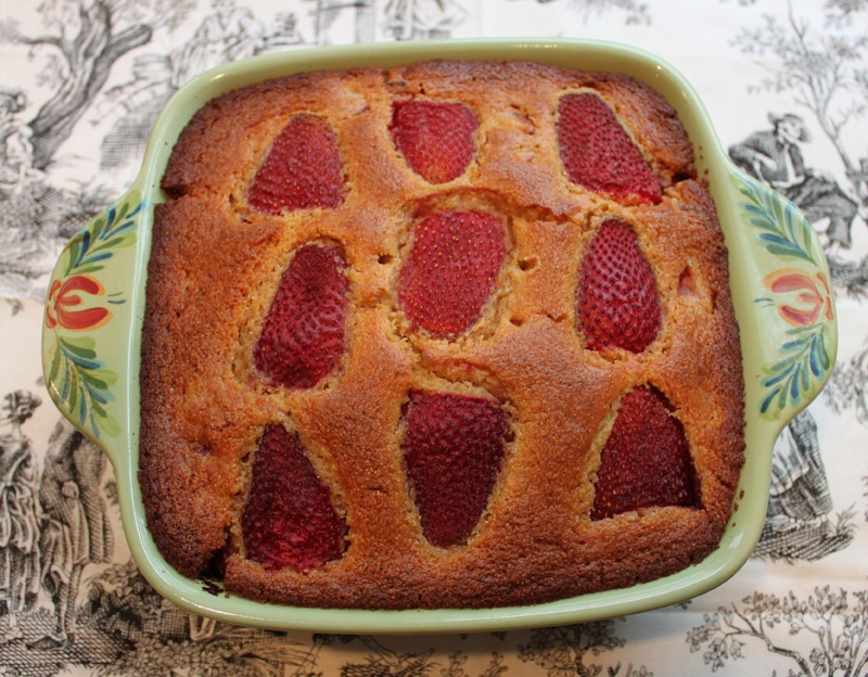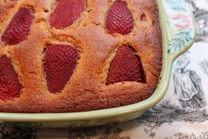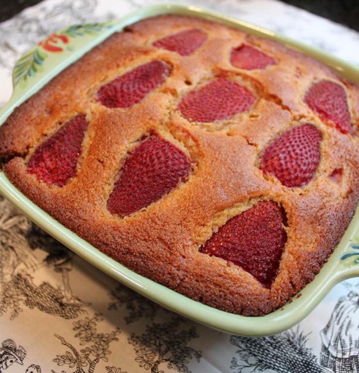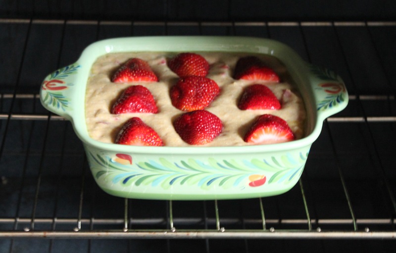 Grease a square baking dish (mine here is about 8×8) and pour in the batter. Garnish the top with the larger strawberry slices. Bake in a 350 degree oven for an hour, rotating once at the halfway point. It may take more or less time to bake depending on what type of dish you use and your oven, just keep testing the middle for doneness after it’s been baking for 45 minutes.