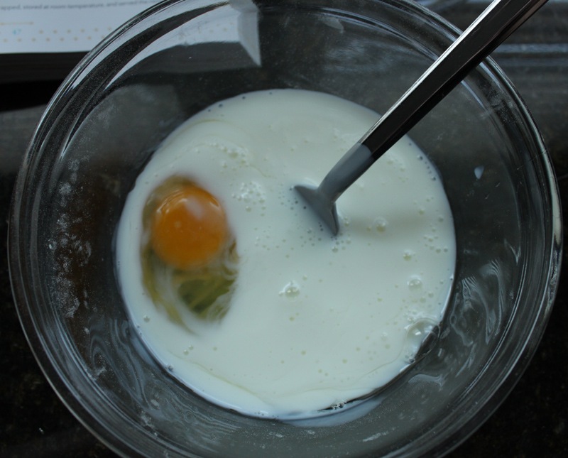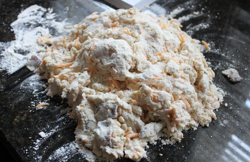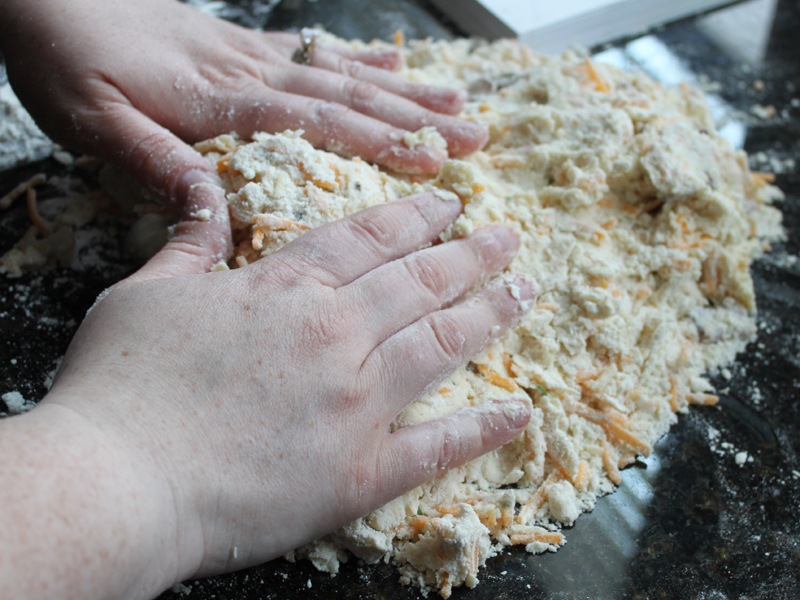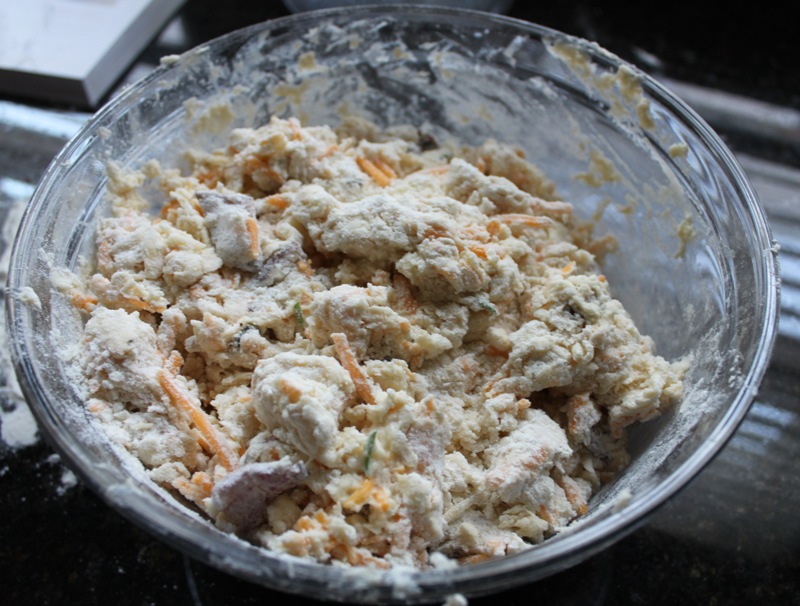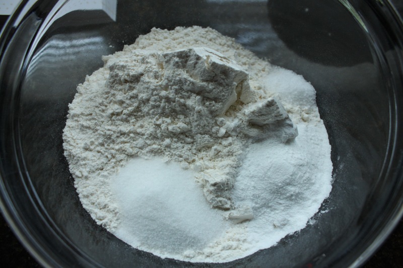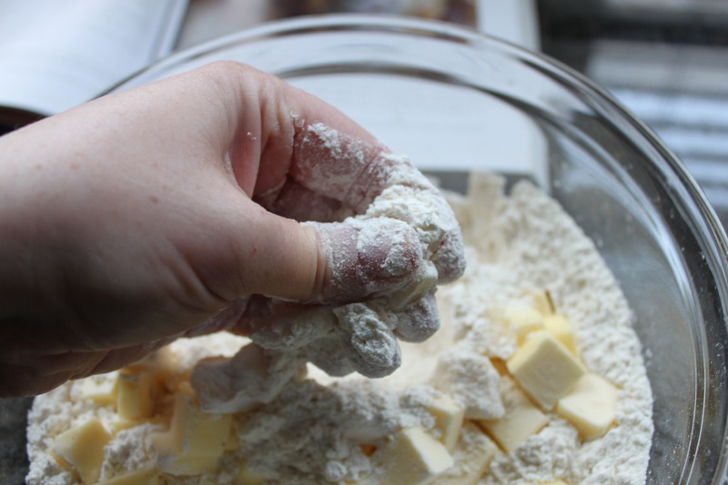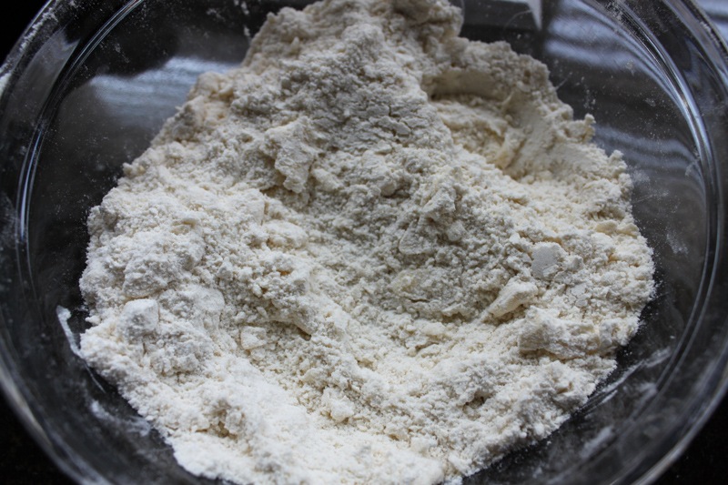 Incorporate the butter into the dry ingredients. You can do this with a fancy dough blender, two butter knives, a fork, or just your hands. I opt for my hands though a real baker would tell me that I’m compromising my butter by getting body heat anywhere near it. Ah well. You’ll know you’re done when the flour looks like course meal and not fine flour (like slightly wet sand rather than dry sand).