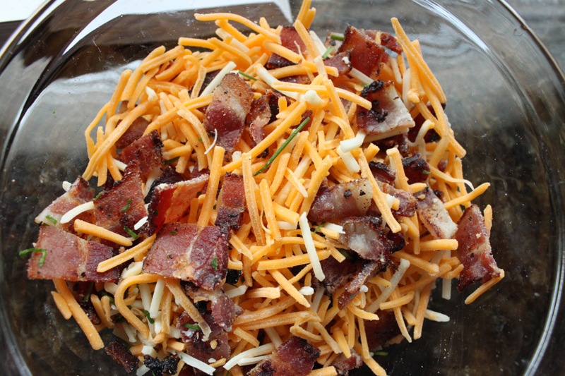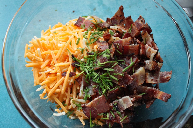 Combine the bacon, cheddar, and chives in a big bowl and set aside.
