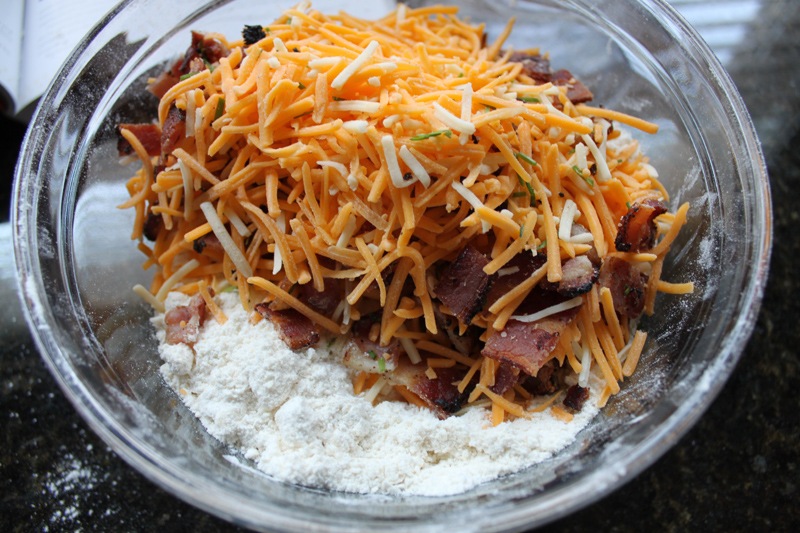Next add the cheddar/chive/bacon mixture into the dry ingredients and mix together.