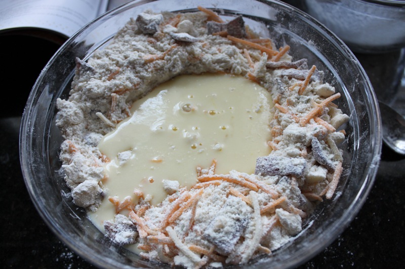 Lastly, create a little well in the dry ingredient bowl and pour in the wet ingredients. Mix together carefully until all the ingredients start to come together.