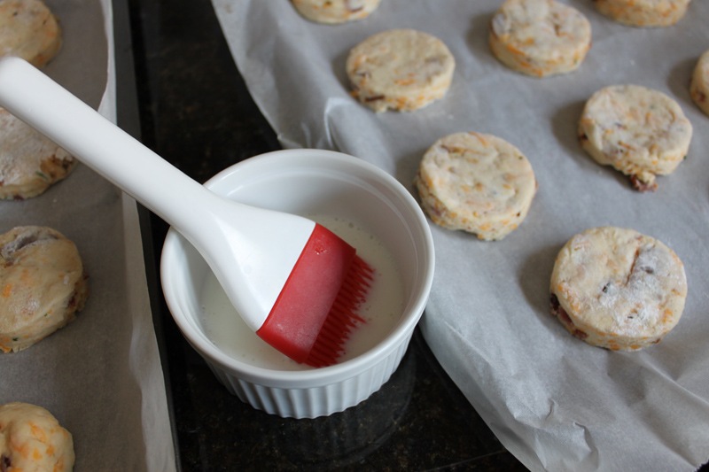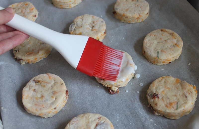 Lightly brush a layer of buttermilk over the top of each biscuit.