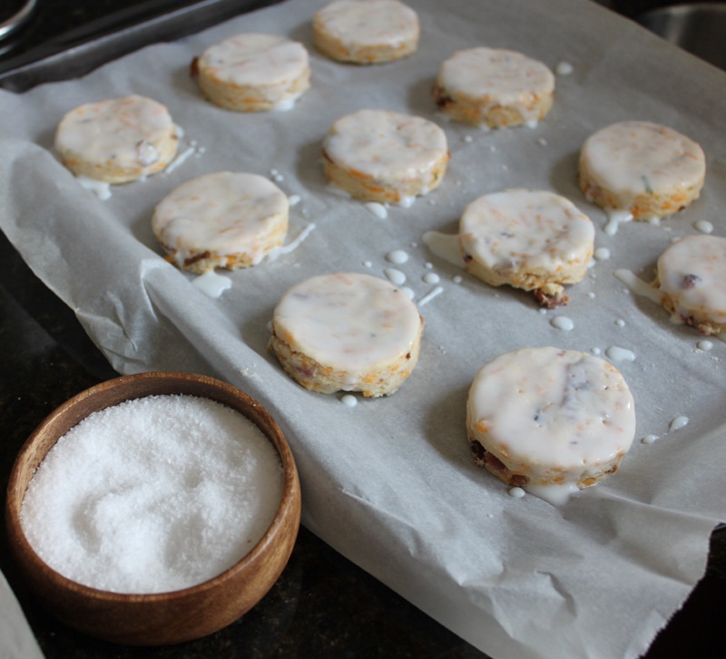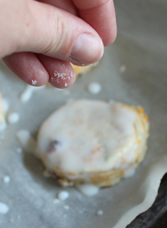 Sprinkle a little kosher salt on top of the buttermilk layer on each biscuit too.