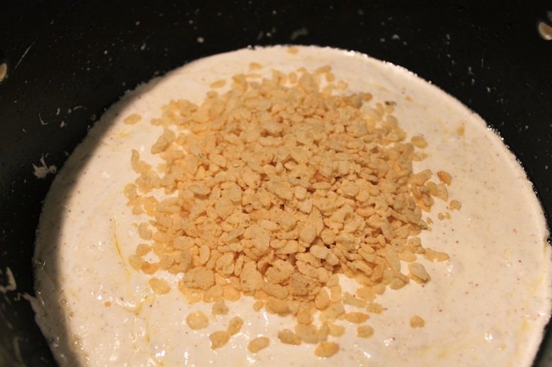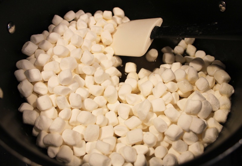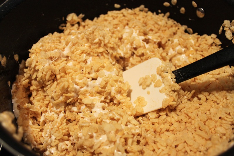 Next take the rice krispies and slowly incorporate them into the melted mallows.