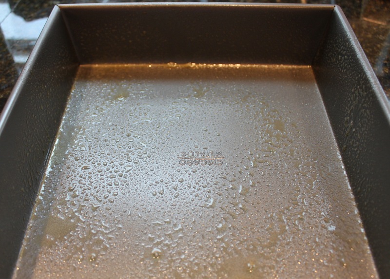 When the mixture is thoroughly combined, spread it out evenly into a greased dish. Anything will do here (I used my favorite brownie pan). You want to make sure the dish you use is deep enough for the rice krispie mixture and ganache on top. I left about an inch for the ganache. Pro tip: dip your hands in cold water before pressing the rice krispie mixture down into the pan and it won’t stick to your hands! When this is done, put the whole thing in the fridge to set.