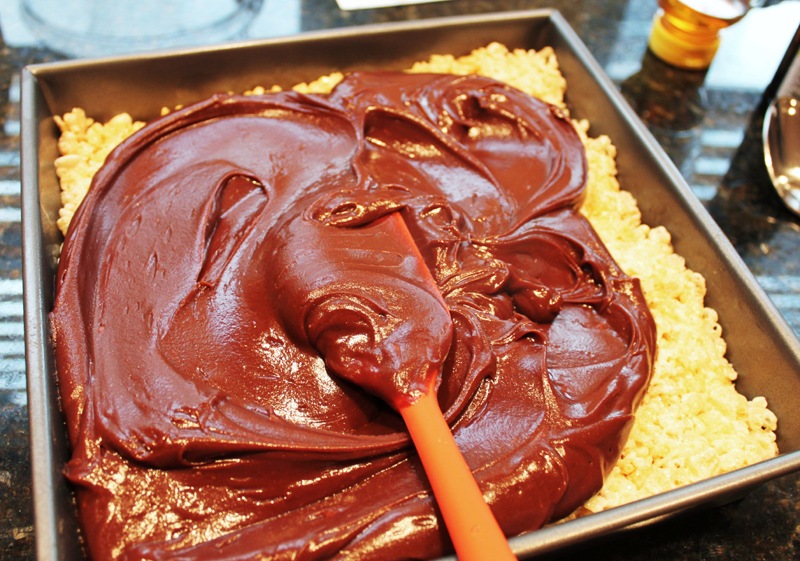 Pour the ganache over the rice krispie mixture.