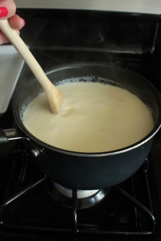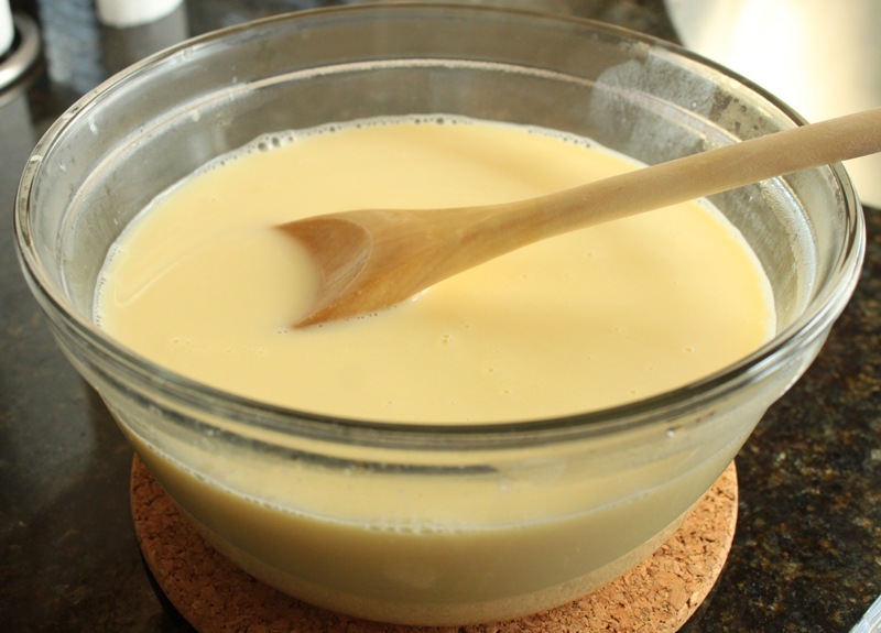 To temper the eggs: Take a cup of the hot mixture and slowly pour it into the bowl of yolks, whisking quickly and constantly. You have to do this slowly or you’ll end up with scrambled eggs. I mixed in just about 3 cups of my hot mixture before the temperature was up high enough to pour the entire bowl back into my sauce pan without scrambling the eggs.