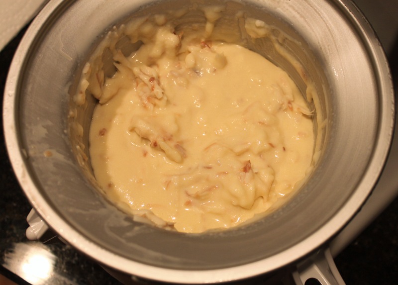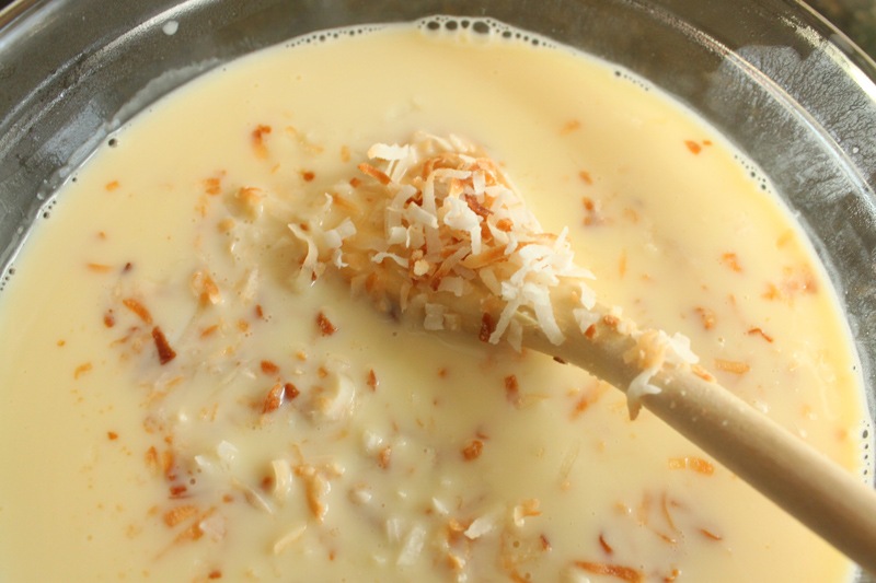 Add half of the toasted coconut to the custard now. At this point I let the custard cool on the counter for about 2 hours. I then covered it and let it sit in the fridge for 5 hours. Before making the ice cream, the batter needs to be cold. You can’t pour warm batter into an ice cream attachment, it won’t stay cold enough to form ice crystals.