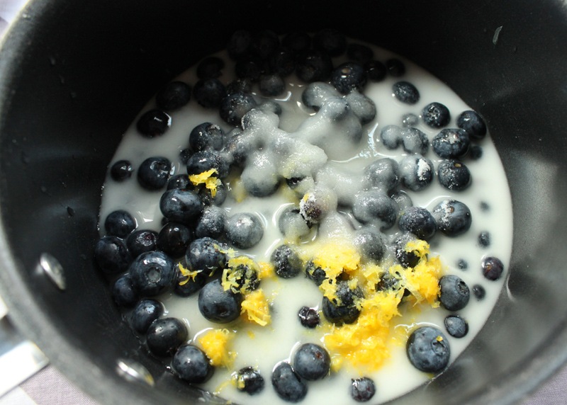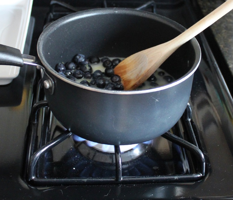 The first step is to make the blueberry topping. Start by combining all of the ingredients in a sauce pot over medium heat.