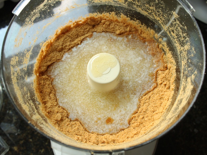 Add the melted butter to the crumbs and pulse until the two are fully combined. It will look like wet sand.