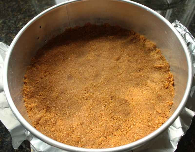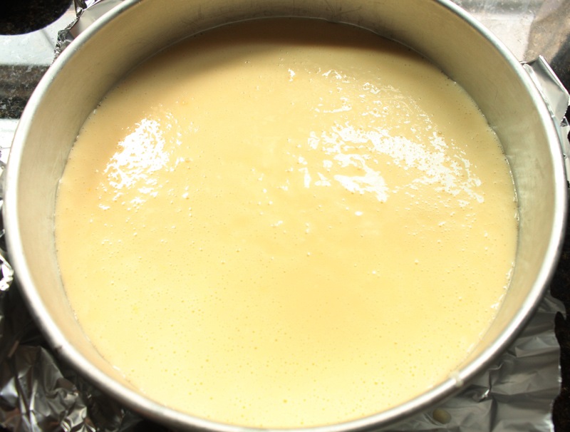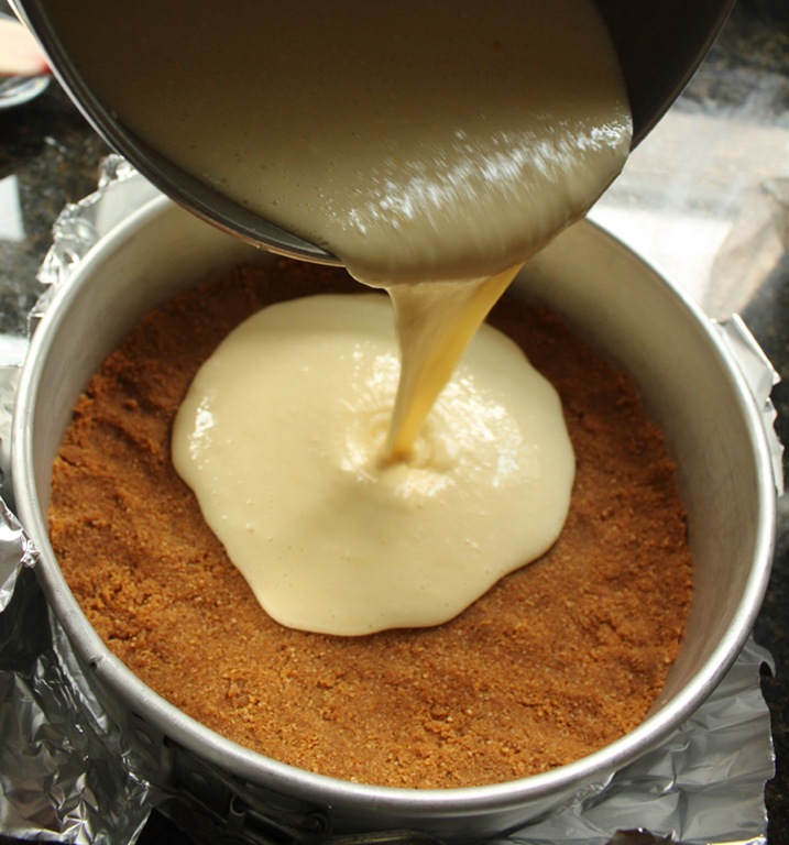 When the cheesecake filling is complete, pour it over the crust into the springform pan.