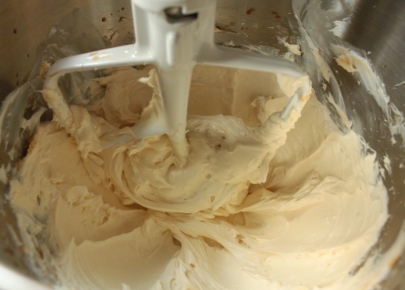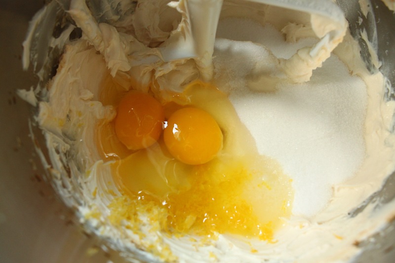 To make the cheesecake filling, first whip up the cream cheese in a stand mixer or large bowl. Add in the rest of the ingredients and mix together thoroughly. The key to having a cohesive mixture here is having all of the ingredients at room temperature – specifically the cream cheese, eggs, and milk. If they aren’t, the mixture will probably be lumpy.