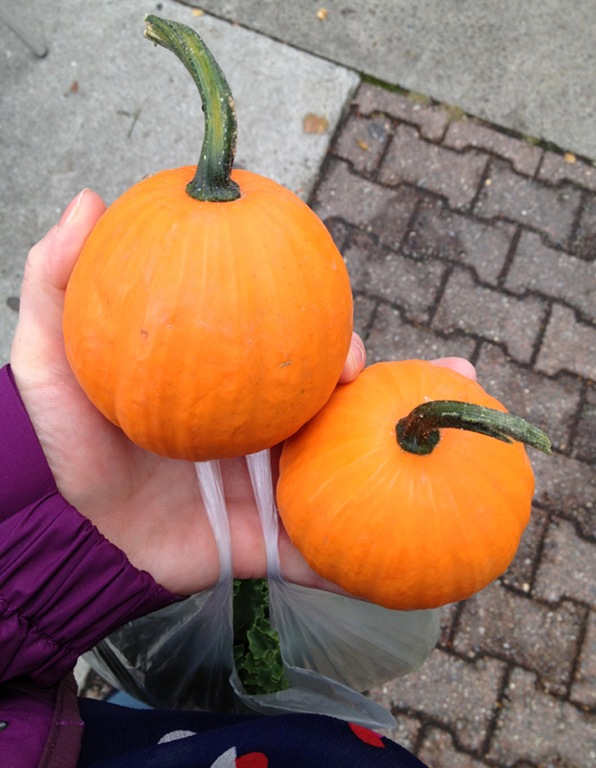 I think my favorite thing we got though were these two little pumpkins. I immediately put them on our dining room table for a Fall decoration when we got home. Reggie approved.