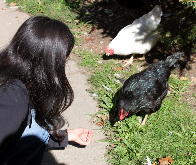 I called Mel the Chicken Whisperer because the chickens all came out from under the pine tree for her. So cute!