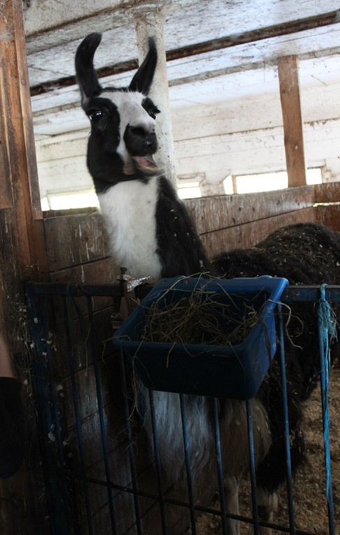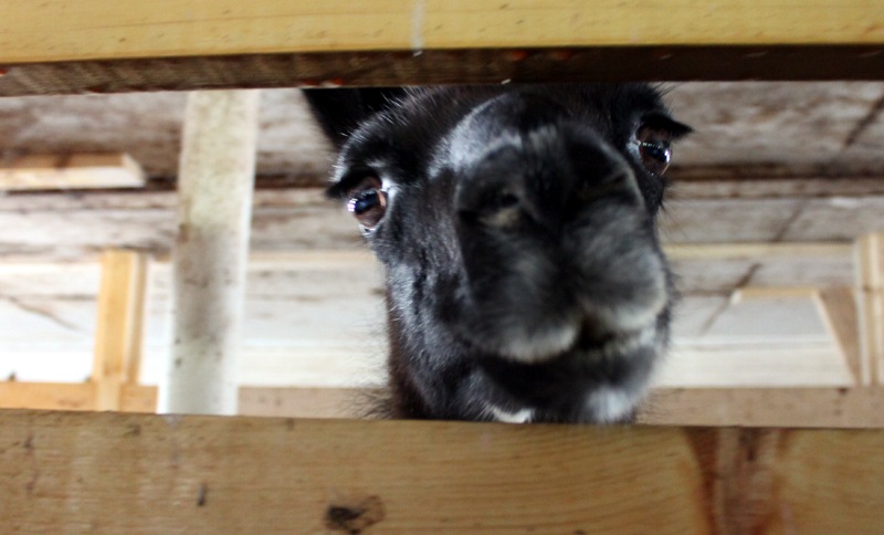This guy was so curious about my camera, he did everything he could to get his head through the slats to sniff at it. It was hilarious! Mind you, his pen is totally open so he could have walked around and not had to squeeze his head through but llamas are not the brightest bulbs I guess.
