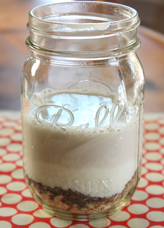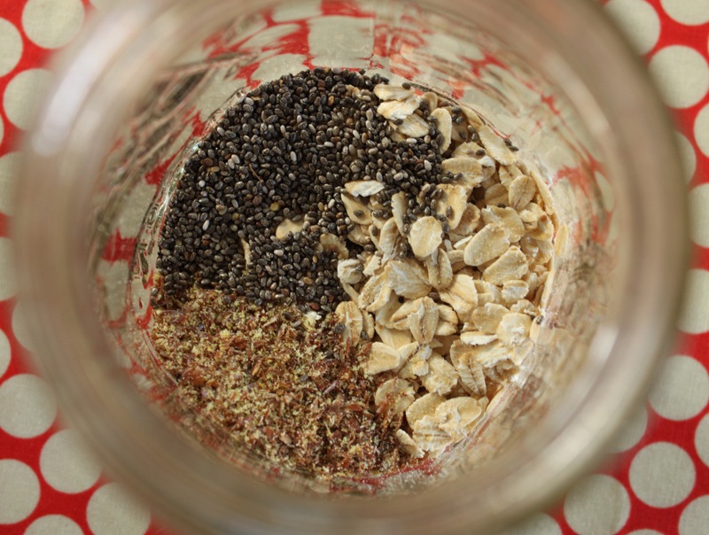 Add the oats, flax seed and chia seeds to the bottom of a 12 oz. mason jar.