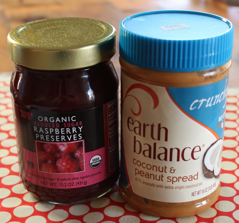 Give the jar a quick shake. Then add in the peanut butter and jelly. And kind of either item will do (I used raspberry and crunchy peanut butter).