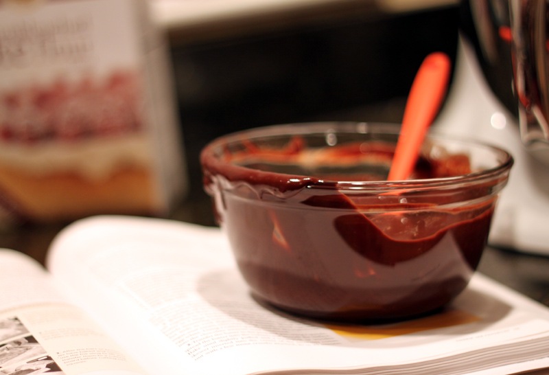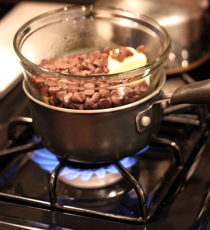 Start by melting the chocolate and butter together over a double boiler.